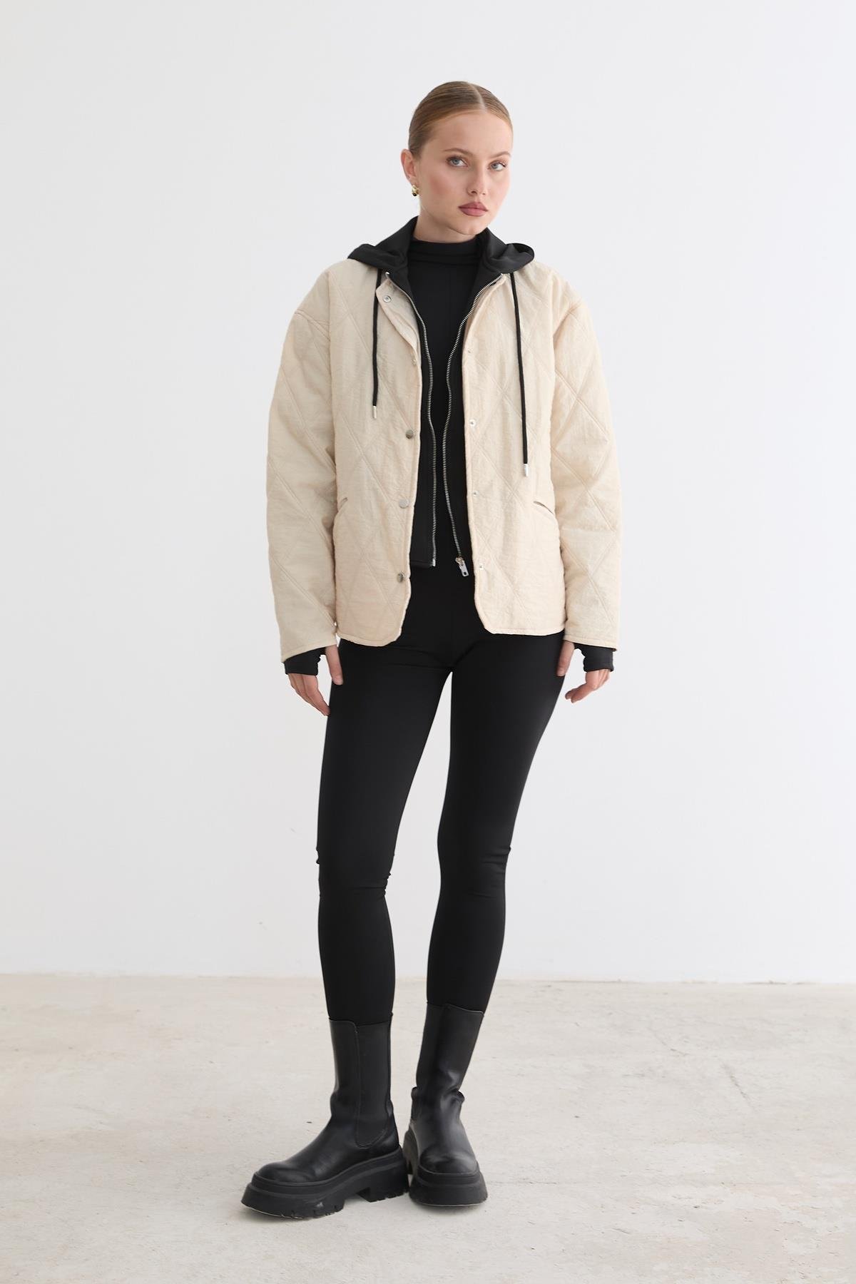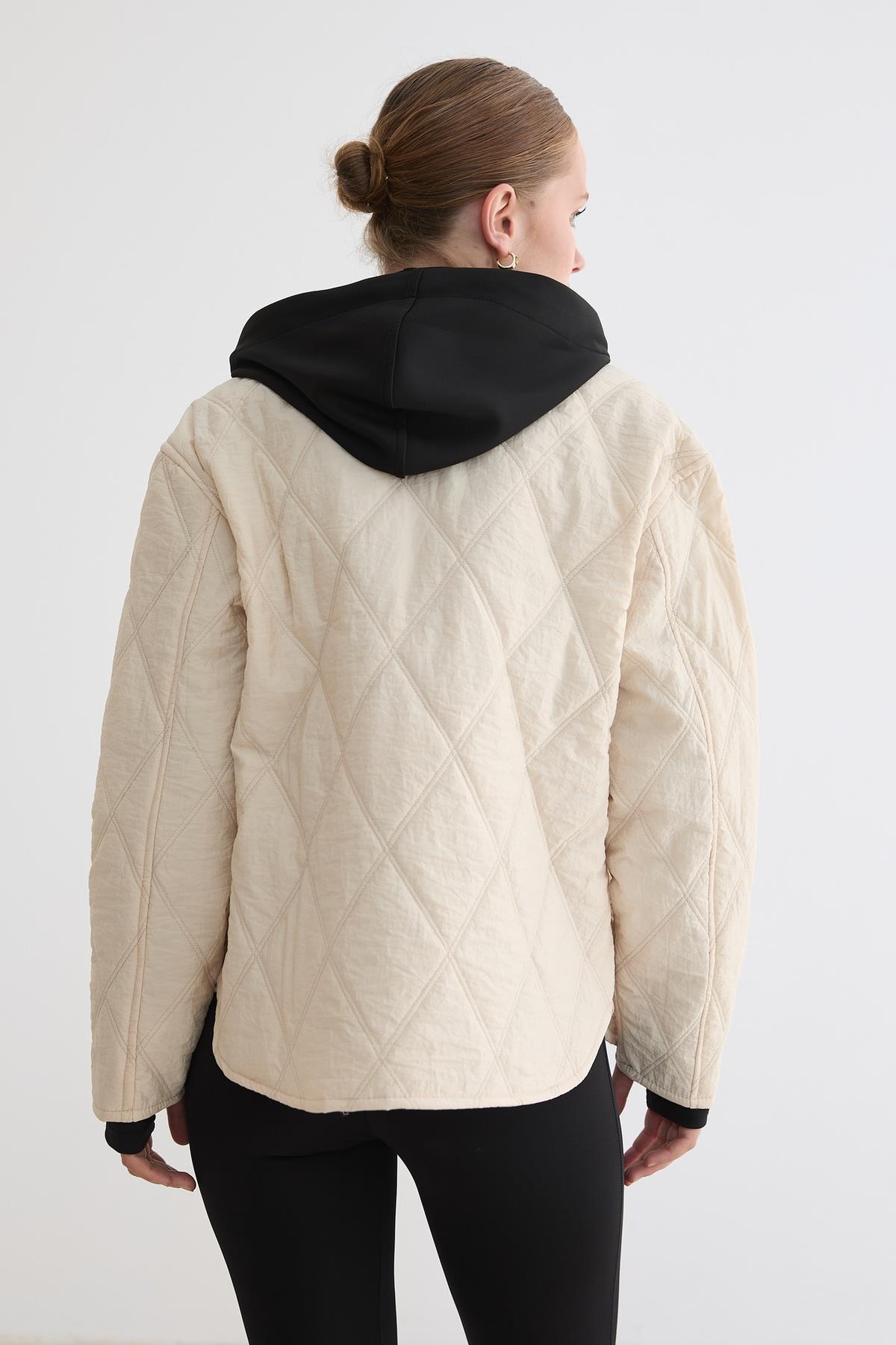 Kadın Kapüşonlu Garni Detaylı Kapitone Mont TAŞ (M28-5841**-TAŞ-L)
